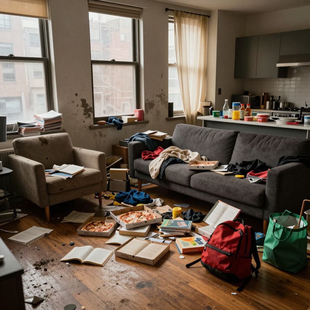 A typical Manhattan apartment overwhelmed by daily mess and dust, creating stress and discomfort for residents.